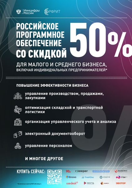 Компании и индивидуальные предприниматели с годовым доходом до 2 млрд ₽ и числом сотрудников не более 250 человек могут приобрести SaaS-решения российских разработчиков со скидкой 50%.