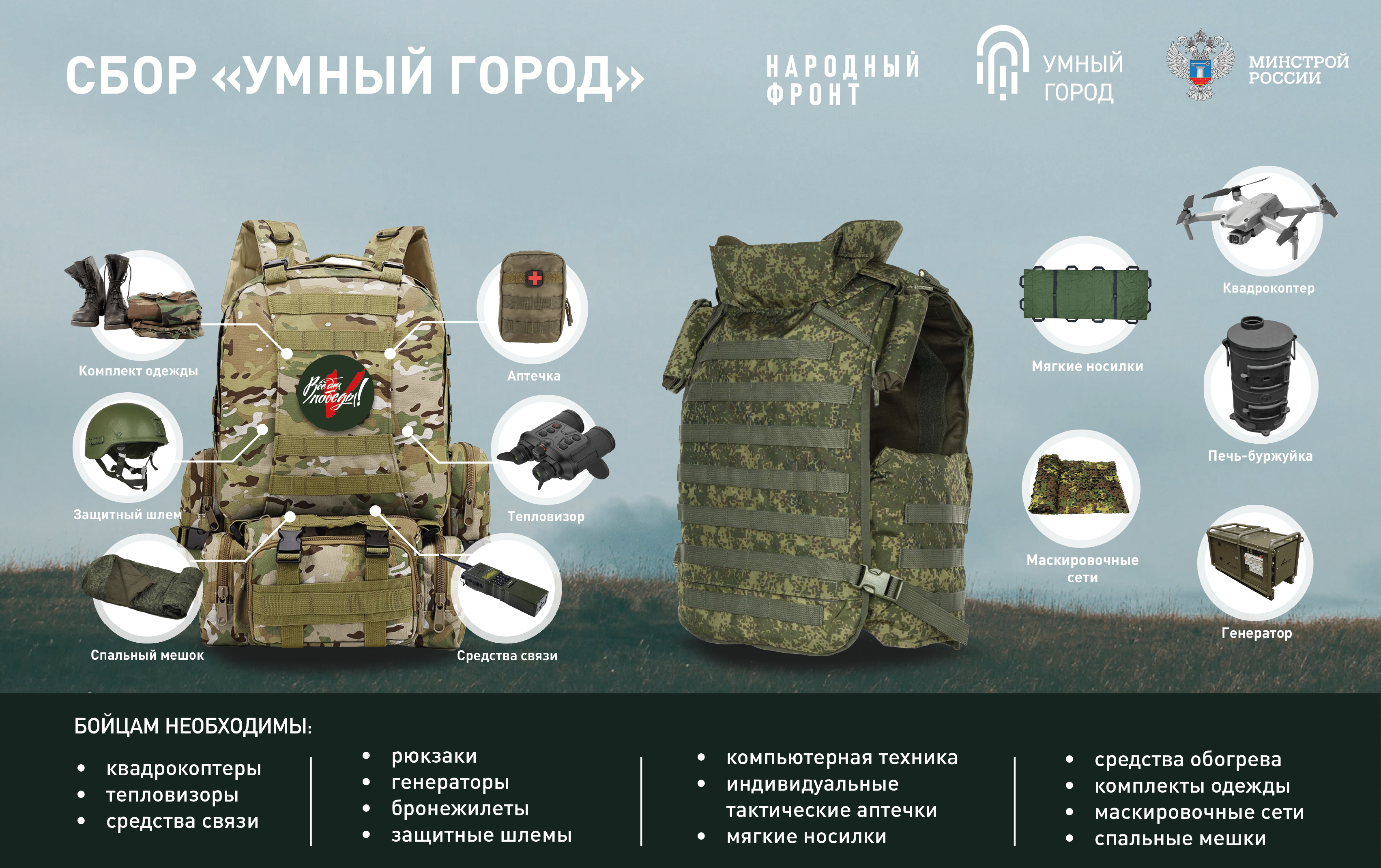КВАДРОКОПТЕРЫ ТЕПЛОВИЗОРЫ СРЕДСТВА СВЯЗИ БРОНЕЖИЛЕТЫ, ЗАЩИТНЫЕ ШЛЕМЫ ГЕНЕРАТОРЫ КОМПЬЮТЕРНАЯ ТЕХНИКА ИНДИВИДУАЛЬНЫЕ ТАКТИЧЕСКИЕ АПТЕЧКИ МЯГКИЕ НОСИЛКИ СПАЛЬНЫЕ МЕШКИ РЮКЗАКИ СРЕДСТВА ОБОГРЕВА ТЕПЛЫЕ ВЕЩИ МАСКИРОВОЧНЫЕ СЕТИ