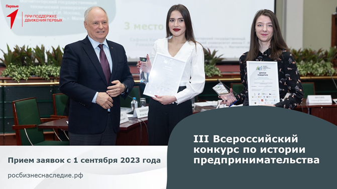 С 1 сентября 2023 года начался прием заявок на III Всероссийский конкурс по истории предпринимательства «Наследие выдающихся предпринимателей России». К участию в Конкурсе приглашаются школы, ссузы и вузы России. Положение о Конкурсе можно скачать на официальном сайте: https://росбизнеснаследие.рф