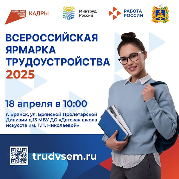 В рамках федерального проекта «Человек труда» национального проекта «Кадры», направленного на популяризацию востребованных профессий, организуется проведение Всероссийской ярмарки трудоустройства, региональный этап которой пройдет в Брянской области 18 апреля.